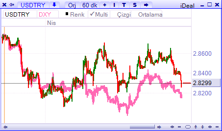 Dün FED baÅŸkanlarından Dudley’in konuÅŸmaları, ABD’de faiz artırımlarının kademeli ve temkinli olacağı beklentisini yaratınca Dolar endeksi (DXY) gerilemeye baÅŸladı ve bu durum dolar/TL kurunu da aÅŸağı çekti. AÅŸağıdaki grafikte pembe çizgi DXY endeksini gösterirken diÄŸer barlar Dolar/TL kurunu göstermektedir.