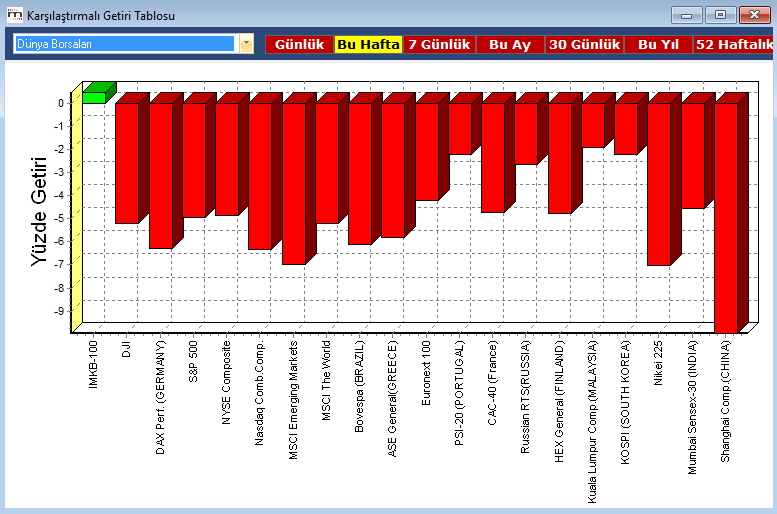 Piyasalara gelince, gerçekten de baÅŸ döndürücü bir dalga yaÅŸandı. Bir gün artık destekler kırılıyor denilirken, diÄŸer gün “yükseliÅŸ baÅŸladı” ÅŸeklinde oluÅŸan  kanı ertesi gün yeniden deÄŸiÅŸti. Aslında tüm bu geliÅŸmeleri biliyorsunuz. GeçmiÅŸi fazla anlatmama gerek yok. Çin borsasının kapatılması, Kuzey Kore’nin nükleer deneme yaptığını açıklaması, petrol fiyatlarının tarihi diplere gelerek özellikle emtia üreten ülkelerin borsalarında da sert düşüşlere neden olması, ABD borsasında S&P500’ün yaklaşık yüzde 17’sinin petrol ÅŸirketlerinden oluÅŸtuÄŸu göz önüne alındığında, ABD borsalarında sert düşüşlerin olması elbette ki bizi de çok etkiledi. Geçen hafta yaptığım youtube yayınında endeksin doÄŸal gidiÅŸatında ikinci bir düşüş yapabileceÄŸini belirtmiÅŸtim ama, dış ÅŸokların ardı ardına bu derece sert geleceÄŸi varsayımı yoktu. Yine de, Borsamız çok iyi dayandı. Son bir haftadaki getiriler (Bugünkü endeksin son deÄŸeri de dikkate alındığında) aÅŸağıdaki ÅŸekildedir.